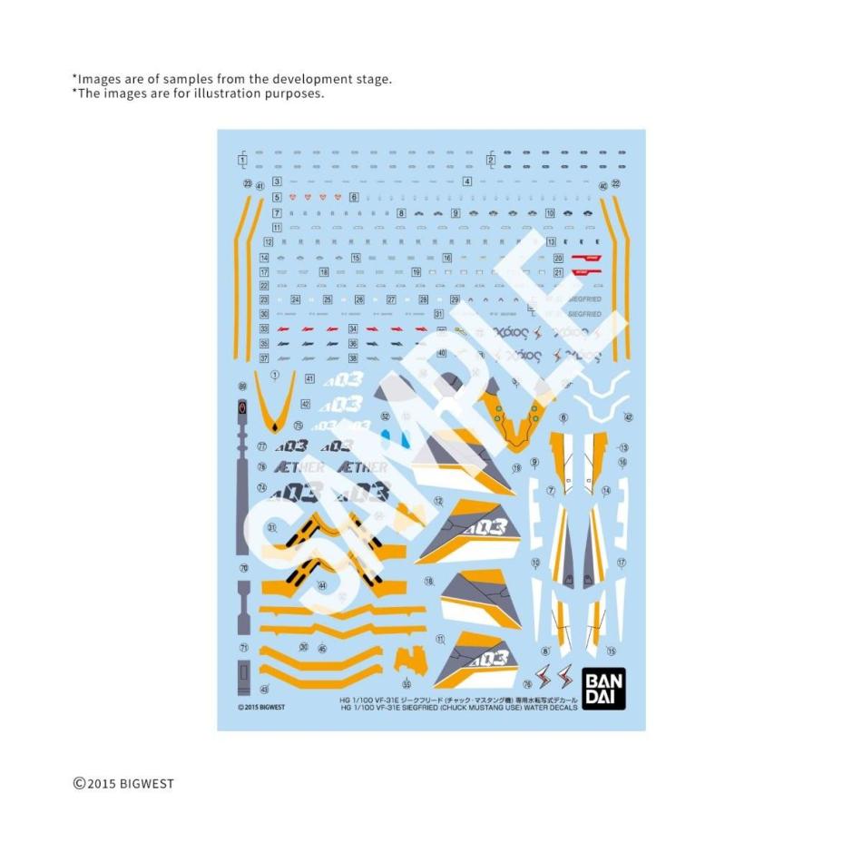 One HG 1/100 VF-31E Siegfried (Chuck Mustang Use) Water Decals is supplied, and some assembly may be required.
