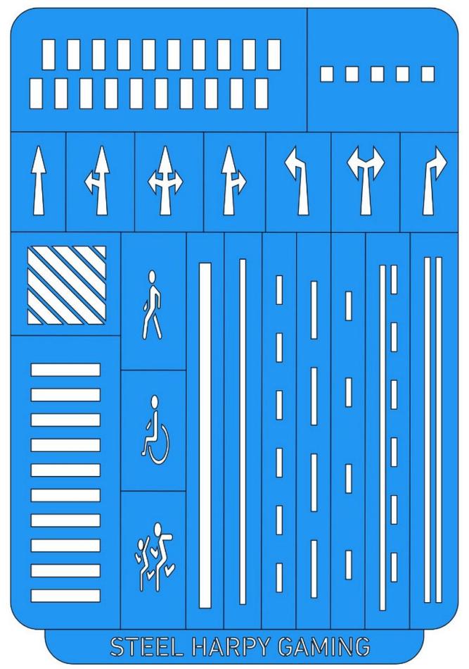 One Steel Harpy Gaming: Road Markings - Vinyl Stencil is supplied.