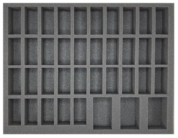 1 inch (25 mm) thick tray with 35x 1 1/4 x 2 1/2 inch (31 x 64 mm) cut outs and 3x 1 3/4 x 3 inch (44 x 76 mm) cut outs.