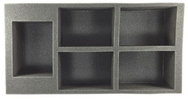 3 inch (76 mm ) thick tray with 5x 5 x 3 1/2 inch (127 x 89 mm) cut outs.