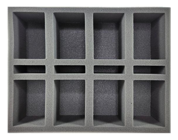3 inch (76 mm) thick tray with 8x 4 1/2 x 3 1/4 inch (114 x 83 mm) and 4x 3 1/4 x 1 inch (83 x 25 mm) cut outs.