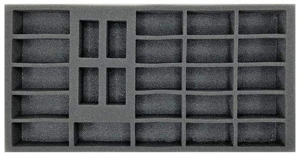 1.5 inch (38 mm) thick tray with 6x 3 x 1 1/4 inch (76 x 31 mm) cut outs, 4x 2 x 1 inch (51 x 25 mm) cut outs and 15x 2 1/2 x 1 1/4 inch (64 x 31 mm) cut outs.