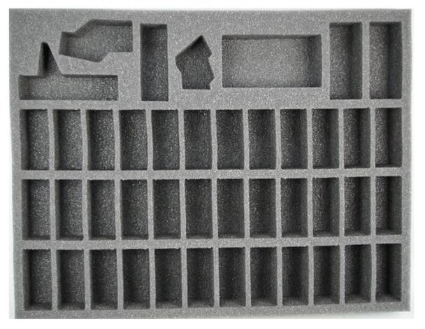 1.5 inch (38 mm) thick tray with 36x 2 1/4 x 1 inch (57 x 25 mm) cut outs, 2x 3 x 1 1/4 inch (76 x 31 mm) cut outs, 1x 3 x 1 inch (76 x 25 mm) cut outs and 1x 3 3/4 x 2 inch (95 x 51 mm) cut outs.