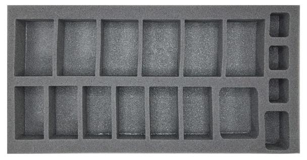 1.5 inch (38 mm) thick tray with 6x 3 x 2 inch (76 x 51 mm) cut outs, 6x 2 3/4 x 1 1/2 inch (69 x 38 mm) cut outs, 1x 2 3/4 x 2 inch (69 x 51 mm) cut outs, 1x 2 x 1 1/2 inch (51 x 38 mm) cut out and 3x 1 1/2 x 1 inch (38 x 25 mm) cut outs.