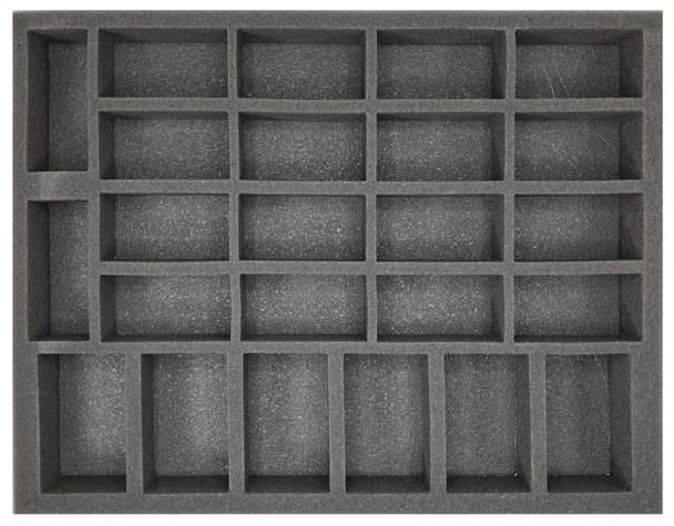 1.5 inch (38 mm) thick tray with 6x 3 1/4 x 2 inch (82 x 51 mm) cut outs, 16x 3 x 1 1/2 inch (76 x 38 mm) cut outs, and 2x 3 1/4 x 1 1/4 inch (82 x 31 mm) cut outs.