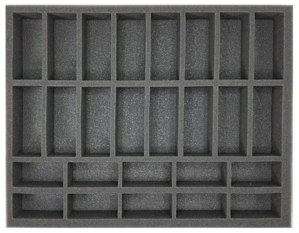 1.5 inch (38 mm) thick tray with 16x 3 3/4 x 1 1/2 inch (95 x 38 mm) cut outs and 10x 2 3/4 x 1 1/4 inch (69 x 31 mm) cut outs.
