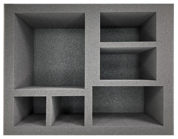 6 inch (152 mm) thick tray with 1x 7 x 6 1/2 inch (178 x 165 mm) cut out, 2x 3 x 3 inch (76 x 76 mm) cut outs, 2x 5 x 2 3/4 inch (127 x 69 mm) cut outs and 1x 6 1/2 x 3 1/2 inch (165 x 89 mm) cut out.