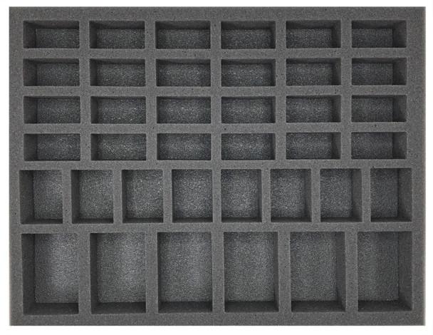 1.5 inch (38 mm) thick tray with 24x 2 x 1 inch (51 x 25 mm) cut outs, 8x 1 1/2 x 2 inch (38 x 51 mm) cut outs and 6x 3 x 2 inch (76 x 51 mm) cut outs.