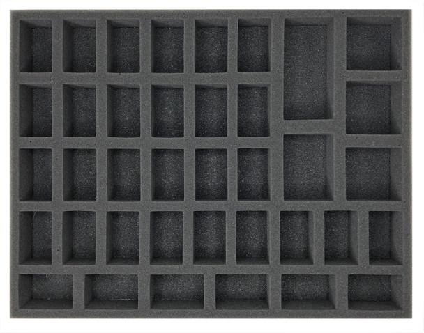 1.5 inch (38 mm) thick tray with 33x 2 1/8 x 1 1/4 inch (53 x 31 mm) cut outs, 3x 2 1/8 x 2 1/8 inch (53 x 53 mm) cut outs, 1x 2 3/4 x 2 inch (69 x 50 mm) cut out and 1x 4 x 2 inch (101 x 50 mm) cut out.