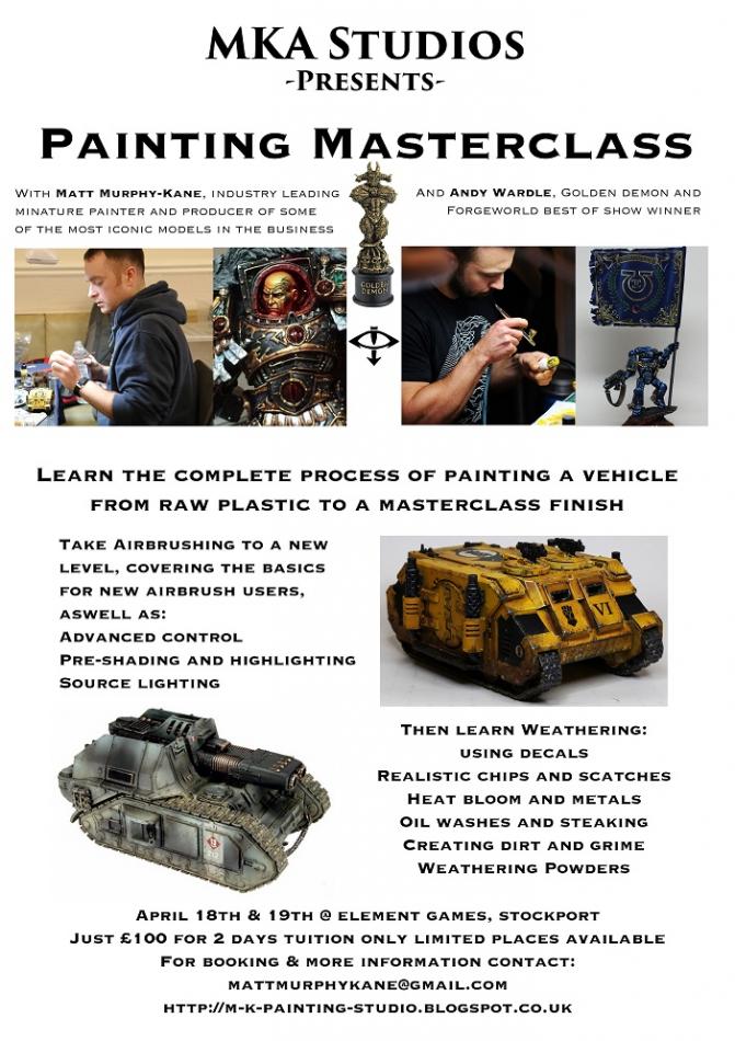 MKA studios is proud to present our masterclass painting weekends. These weekends are designed to take miniature painters of all standards and develop their skills to a new level. Learning how to paint miniatures from the bare plastic all the way to an advanced level. Using many tried and tested techniques that have been used throughout the years. Techniques like pre shading, colour application, washing, blending, chipping, scratching, highlighting, transfer application, weathering powders, oil paints, heat bloom and many more. We will teach you how to turn a freshly manufactured model into a realistic battle hardened veteran of the war zone.