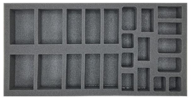 1.5 inch (38 mm) thick tray with 4x 3 x 2 inch (76 x 51 mm) cut outs, 6x 3 x 1 1/4 inch (76 x 31 mm) cut outs, 5x 1 1/2 x 1 inch (38 x 25 mm) cut outs, 5x 2 x 1 inch (51 x 25 mm) cut outs, and 3x 2 x 1 1/2 inch (51 x 38 mm) cut outs.