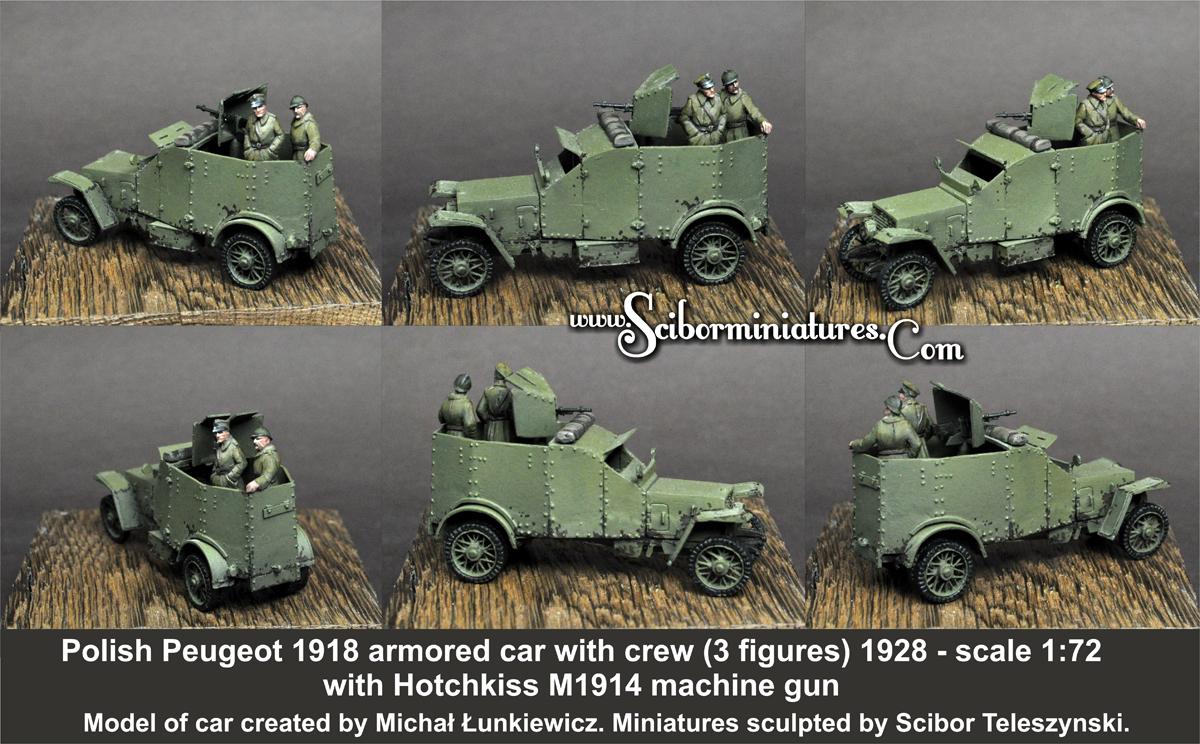 Polish Peugeot 1918 armored car with crew - 3 figures. Model made of high quality resin. Parts unpainted and requires assembly. Model of car created by Michal Lunkiewicz. Figures sculpted by Scibor Teleszynski.
