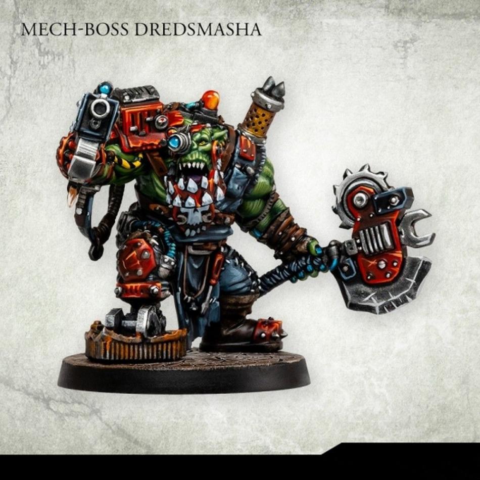 This set contains one multi-part high quality resin model of Mech-Boss Dredsmasha with swappable heads, two melee weapon options (deadly Crusher or his trusted axe) and two right hand options (hand piloting drones or pistol).