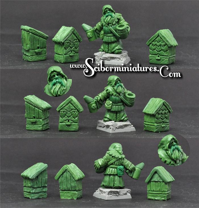 Blister contains 1 unpainted resin miniatures on 20mm square scenic base and 3 beehives.
