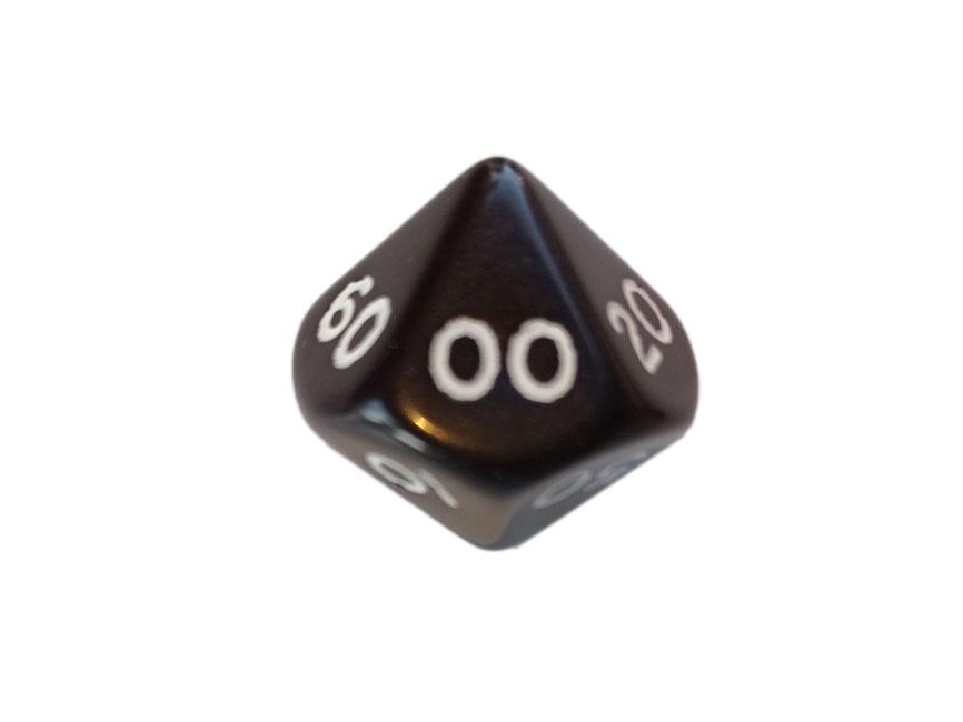 An Opaque Black D10 00-90 Percentile Polydice. This plastic die is approximately 20mm in size, which is the size used in most polydice sets.